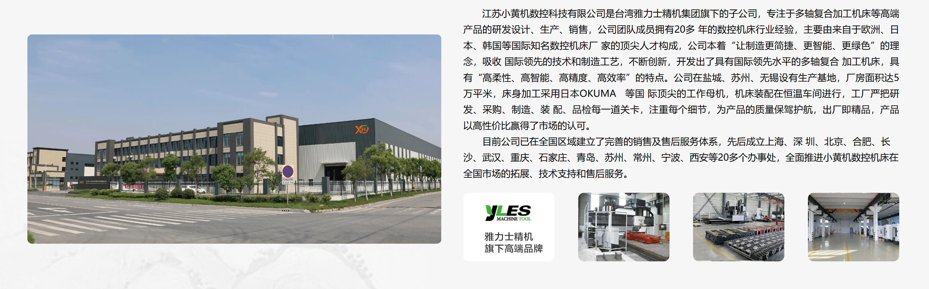 江苏小黄机数控科技有限公司是台湾雅力士精机集团旗下的子公司,专注于多轴复合加工机床等高端产品的研发设计、生产、销售,公司团队成员拥有20多 年的数控机床行业经验,主要由来自于欧洲、日本、韩国等国际知名数控机床厂 家的顶尖人才构成,公司本着“让制造更简捷、更智能、更绿色”的理念,吸收 国际领先的技术和制造工艺,不断创新,开发出了具有国际领先水平的多轴复合 加工机床,具有“高柔性、高智能、高精度、高效率”的特点。公司在盐城、苏州、无锡设有生产基地,厂房面积达5万平米,床身加工采用日本OKUMA 等国 际顶尖的工作母机,机床装配在恒温车间进行,工厂严把研发、采购、制造、装 配、品检每一道关卡,注重每个细节,为产品的质量保驾护航,出厂即精品,产品以高性价比赢得了市场的认可。